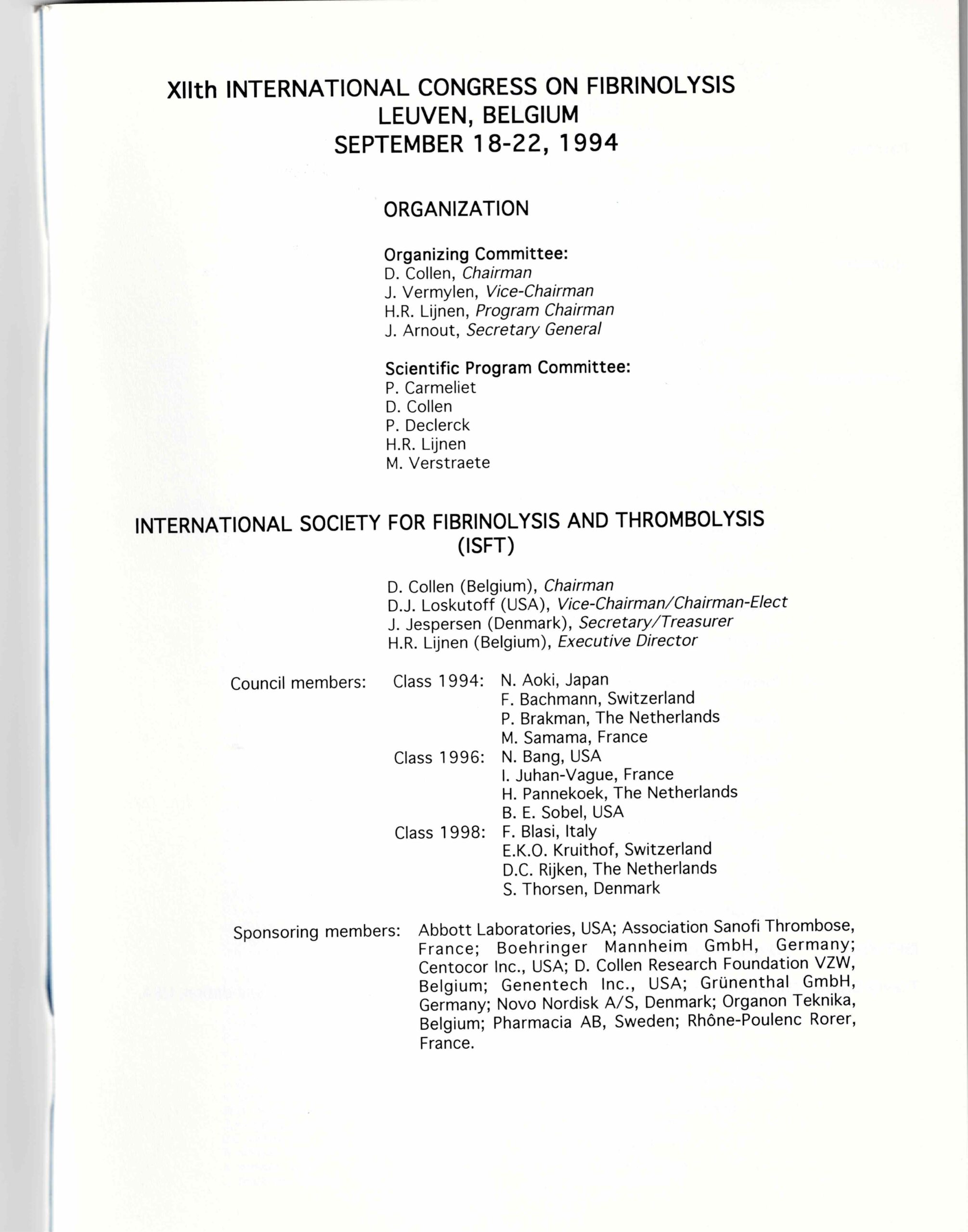 The XIIth International Congress on Fibrinolysis, under the auspices of the International Society for Fibrinolysis and Thrombolysis (ISFT), was organized by the Center for Thrombosis and Vascular Research in Leuven, September 18-22, 1994, under the presidency of D. Collen. At that time, the ISFT had over 400 members from 35 countries.